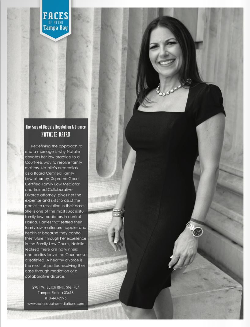 Natalie Baird was featured in Tampa Bay’s METRO Magazine as “The Face of Dispute Resolution & Divorce.” Natalie redefines the approach to ending a marriage and devotes her law practice to a Court-less way to resolve family matters.